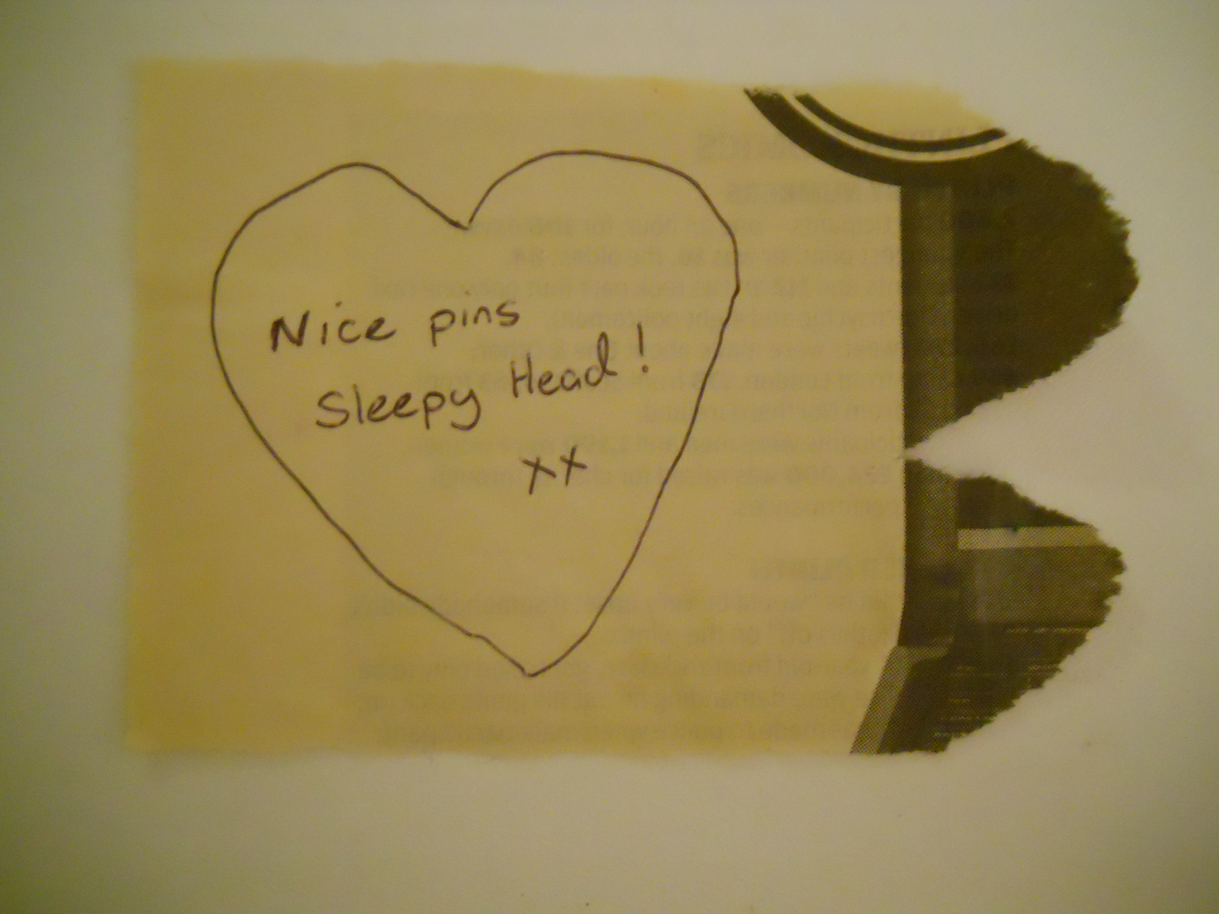 You need to understand that due to some weird genetics, my parent’s skinny legs bypassed me and my sisters.  Where our legs should be, we possess tree trunks.  We are all a little sensitive about this which is why it is surprising that on this particular night last year, I was wearing a short dress and knee high boots.  As is usual for me, I fell asleep on the train almost as soon as it pulled away from London Bridge and woke up minutes before it pulled into Country Bumpkinsville.  Minutes were long enough to see the scrap of paper on the seat next to me with a message on it though.  I looked around to see who it was really intended for, then realised it must be me (there was nobody else on the train at this point, so it had to be).  It said: