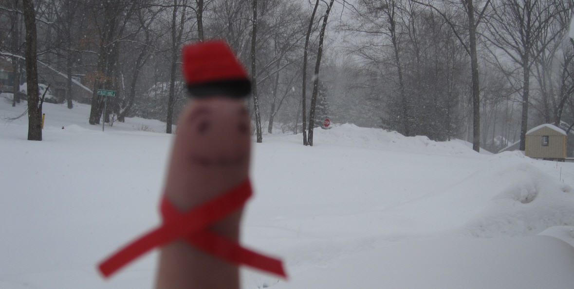 Finger Pog in the big snow in the US (apparently he is a little blurry due to excessive shivering):
