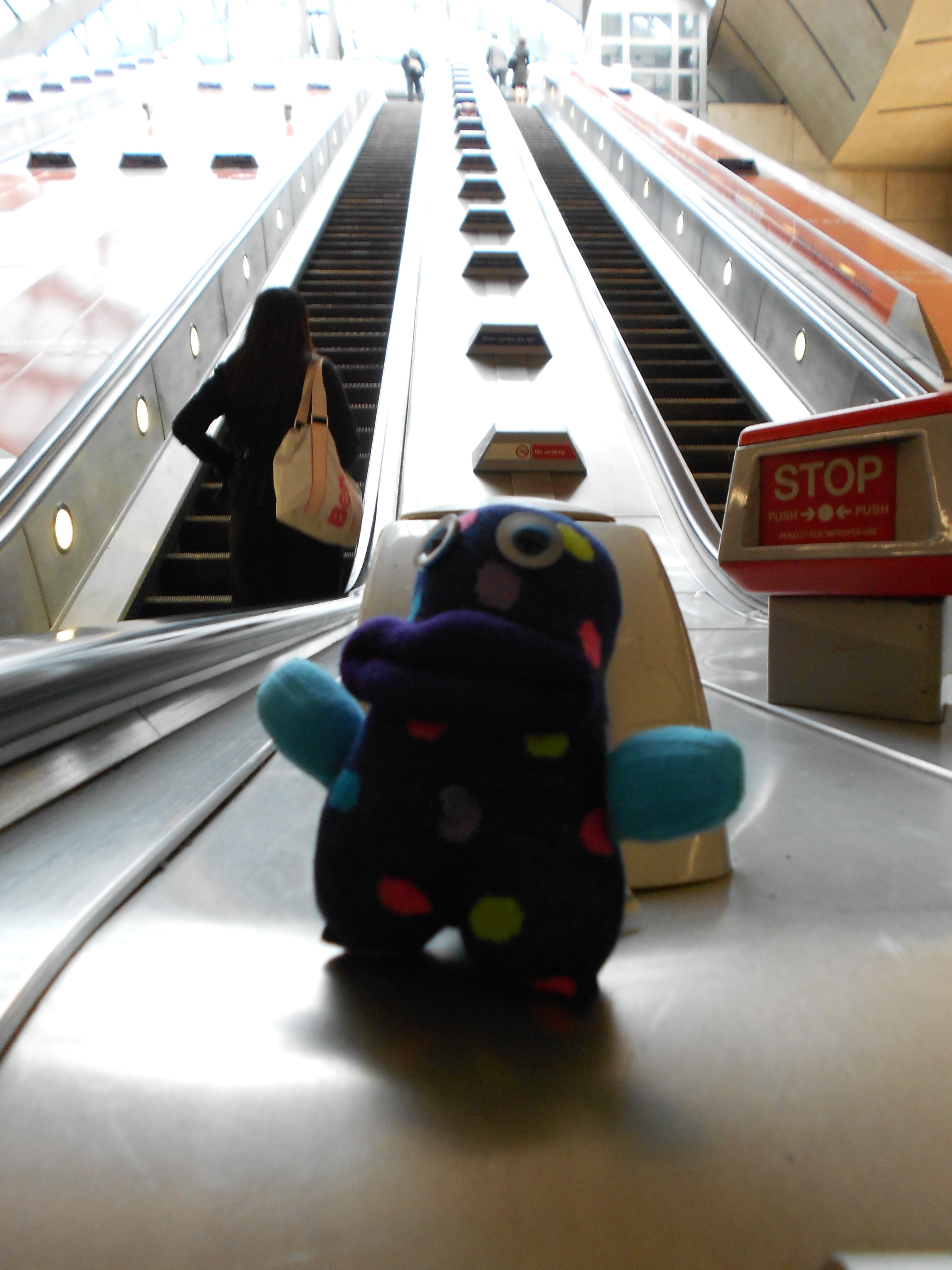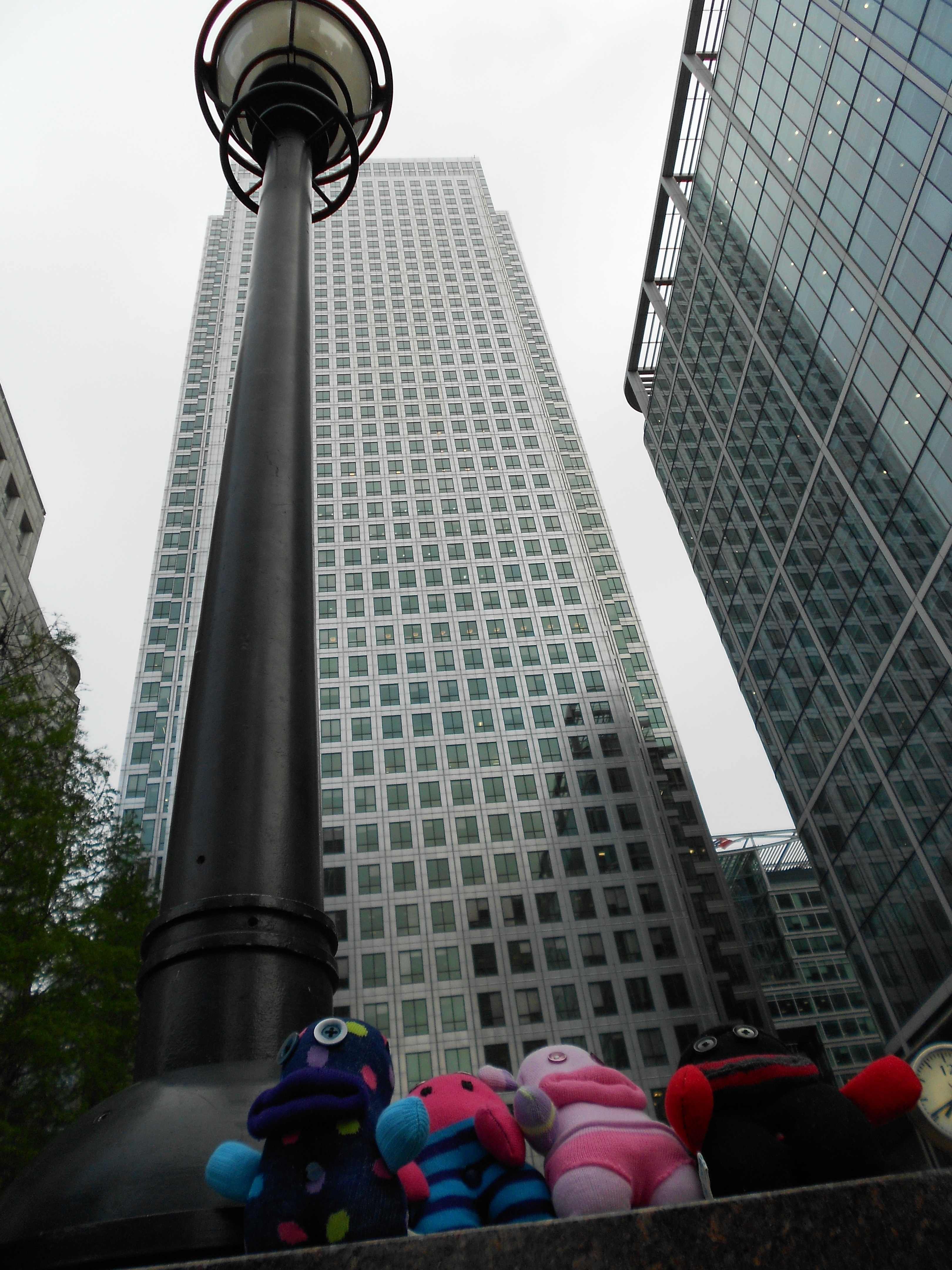 Next we went in a tube. Sadly, for the duration of that we had to stay in Pog’s bag for some reason but she let us have a photo with a deliciously bright Canary Wharf sign afterwards.