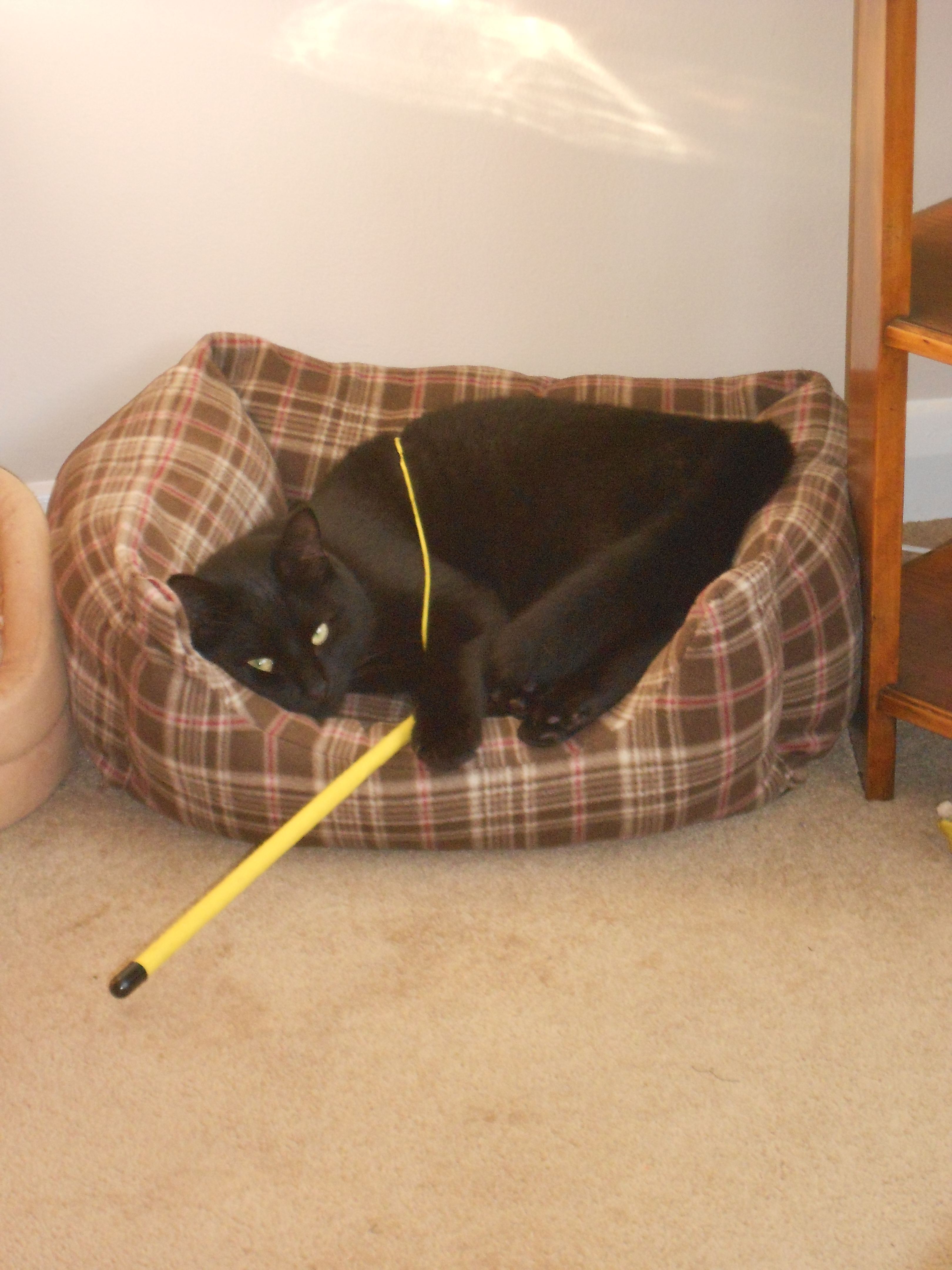 1) I was very happy to see Charlie finally in the dog basket. When he attempted to move though, it turned out that actually he was tangled in that yellow elastic you can see and had just stopped for a breather in his escape plan.