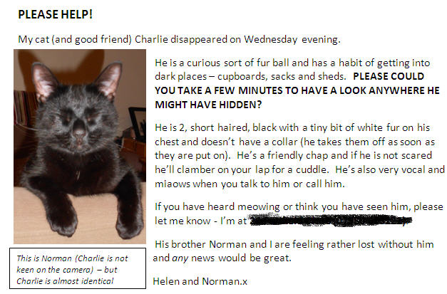 As Facebook friends will know, today has not been the best.  Charlie cat was last seen Wednesday evening – which I know isn’t long ago, but Charlie requires almost hourly cuddles and so when he wasn’t at the end of my bed yesterday morning, I was worried.  He’s not been home since and this morning full blown panic set in.