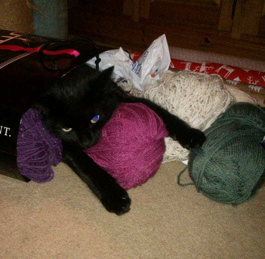 And just so he is not left out, here is the Pog version of a little person: Norman, who has decided that he doesn’t like his bed, or the hand made crocheted blanket I made him, or the early gift of a lovely enclosed bed. No, Norman has taken to emptying my wool bag and turning that into a bed: