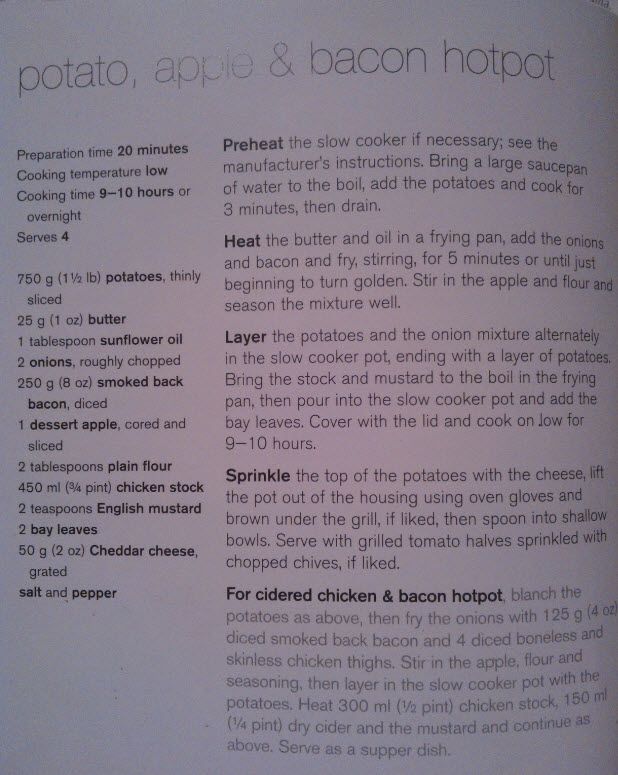 Potato, Apple and Bacon hotpot (from 200 slow cooker recipes by Sara Lewis)