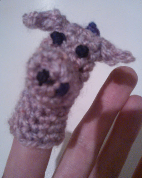 When I got home last night I wasn’t tired enough to sleep and didn’t want to lie in bed thinking about things so I thought I’d attempt a crochet finger puppet. It was supposed to be a dragon. I think what I achieved was a cross between a pig and…um…a poorly looking penis with ears: