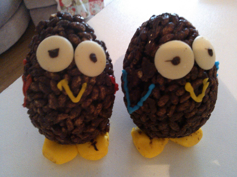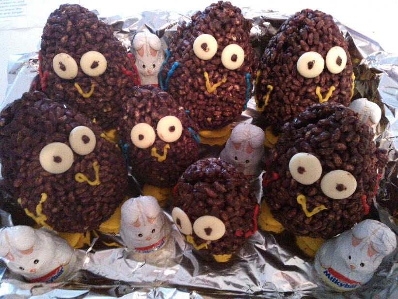 After two and a half hours my kitchen and lounge were covered in chocolate and rice krispies, Norman cat was hiding in the conservatory and my Sunday offering was this: