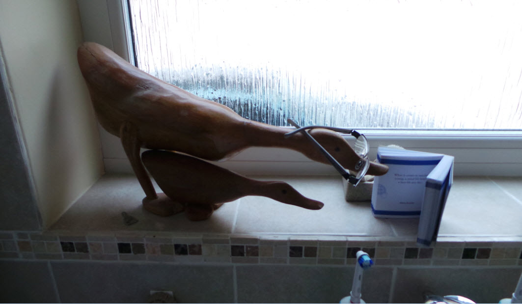 Here we have the wooden ducks in my parents bathroom that ‘asked’ my Dad for something to read, but then decided that glasses were needed. My dad complied entirely: