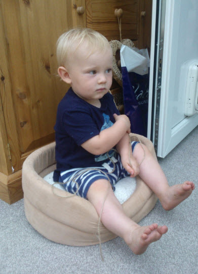 Then sitting in the cat basket while pulling on the huge call of string that was poking out of a drawer behind him:
