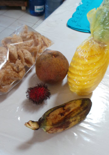 From top right, a pineapple, banana (both taste SO much sweeter than in the UK), the hairy thing is a rambutan, above that is a santol – a really citrusy, almost grapefruit type of fruit and on the left there’s a bag of pork crackling: