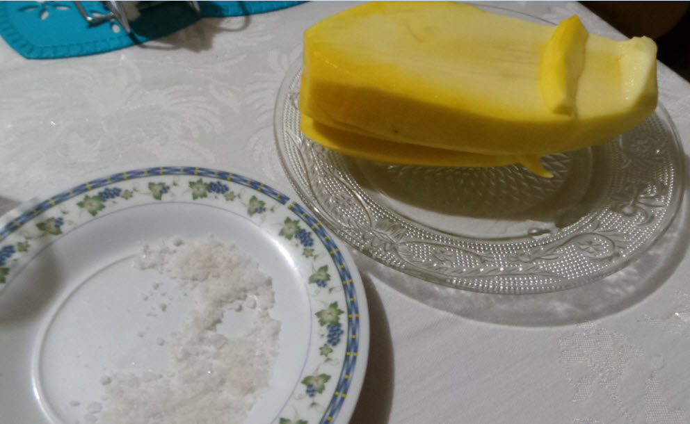 This is green mango, which you dip in salt (you dip pineapple in salt too. Weird). This was a bit bitter for me…