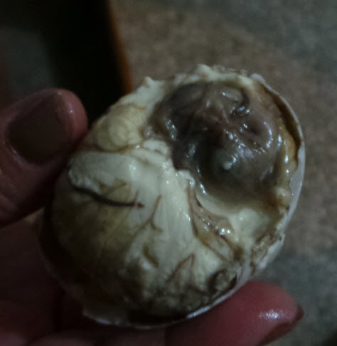 This is a balut. I was told it was a chicken embryo/ boiled egg but a google search has suggested it’s a duck embryo / egg. Either way, I wasn’t about to try one. Which actually is a bit silly when you consider I eat chicken. It seemed worse somehow though. So instead, I took a photo: