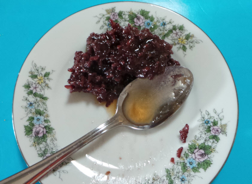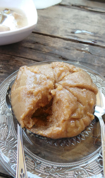 Below is a pudding that Mama Pat made and she let me have this taster while it was cooling. It’s amazing – sticky rice cooked with molasses sugar and (I think) coconut milk. Like a sticky, sweeter version of rice pudding. Yum: