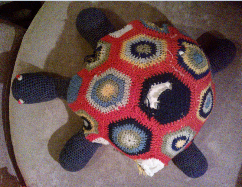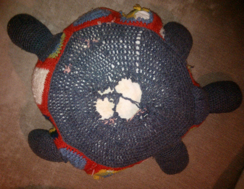 I commented, saying I only crocheted as a hobby, but if nobody else could be found, I’d do my best to help. Nobody else offered and Tortoise arrived at Pog Towers, turning out to be a lot bigger than I thought and in a very sorry state.