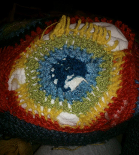 I’ve never tried to fix anything crocheted before – I’d never even made a hexagon, which is what Tortoise was made up of. I looked up a pattern, taught myself a new stitch and rummaged through my wool collection for oddments that matched. It turns out it’s rather tricky to fit new pieces into something old, but I worked out a way and over a few evenings, I nursed Tortoise back to health. I fixed his shell and tummy, reattached his legs and a poorly eye and re-stitched the seams that looked a bit sick. I tried to keep as much of the original stitching as I could.