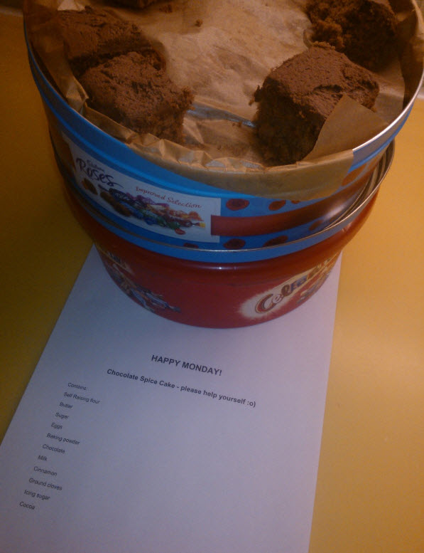 It was time for a bit of secret bakering on Monday. My last offering of flapjacks hadn’t seemed too exciting, so I decided to push the boat out and make my Mum’s chocolate spice cake which is a family favourite. It turns out that when you make four of the things, only have two cake tins and an average sized oven, it also takes hours. Literally. There’s icing and everything.