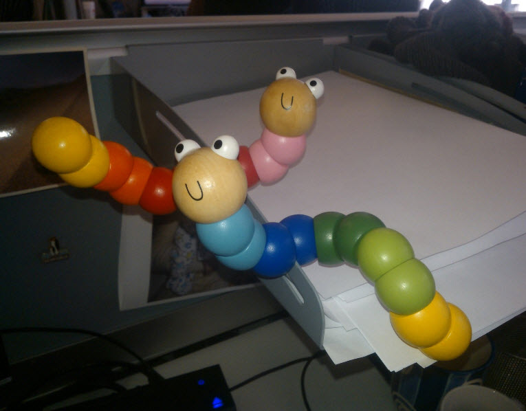 They were a belated birthday present from someone who had seen my Very Hungry Caterpillar cake. And they made me smile a lot. Partly because I have colourful caterpillars hanging out on my desk, but mostly because someone (from my old office, I admit), was lovely enough to send them to me.