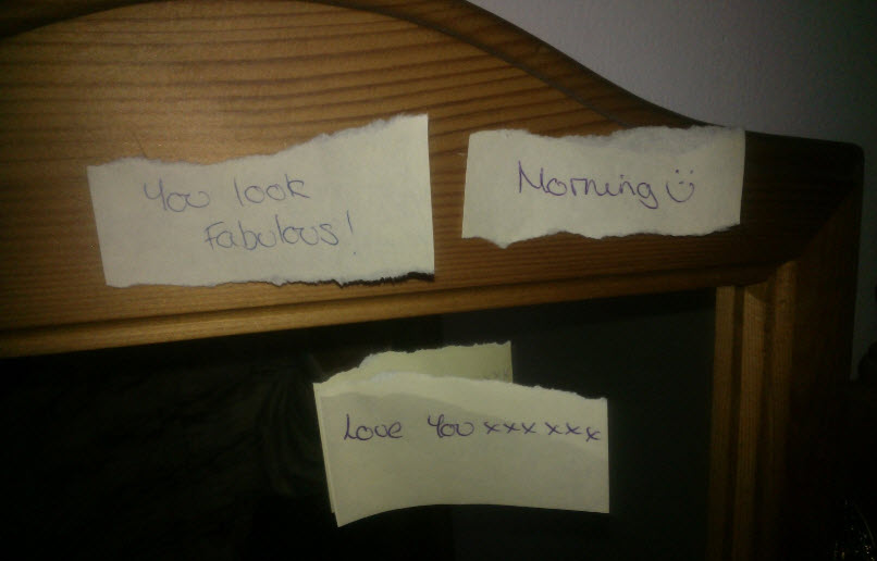 The other great bit about Big House days (the first bit being the ‘big’ bit, not so much the biscuit hunt it results in) is that I get left post it notes. I have a small collection on my mirror now and they make me smile, even at silly o’clock:
