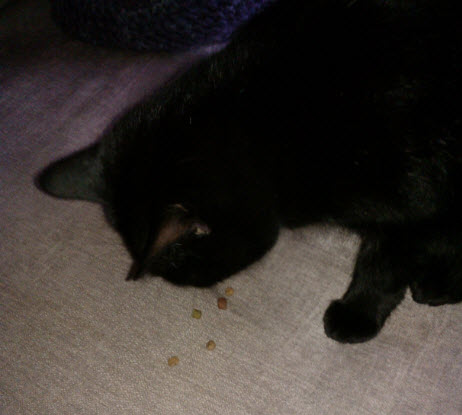 Little Pea is a clever little thing and now every time he comes to visit he gets the closest thing he can to the cat treats – plain old cat biscuits from the cat bowl – and moves from room to room waving g them around and calling for Normy. Norman, not being interested in something he has a bowl full of, stays hidden.