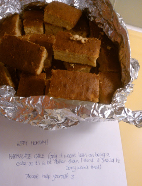 I should have taken note that was called a Marmalade loaf and specified a loaf tin for cooking, but as I was making four of them, and only had one loaf tin I ignored that and just popped them in normal tins. As a result, the loaf refused to cake and was a little on the heavy side…. The homeless man on The Strand that I gave some to for breakfast didn’t seem to mind though, and it all disappeared in the office: