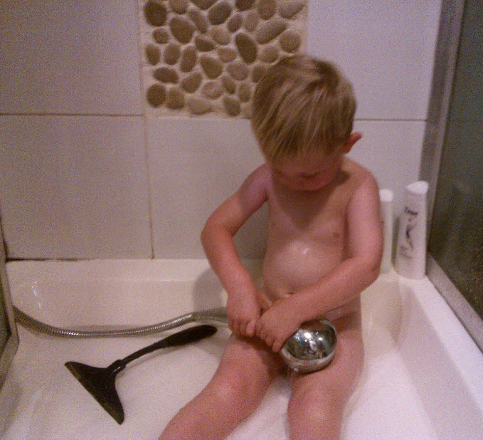 And then it was bath time.  Only Pog Towers doesn’t have a bath…  But we did quite well with the shower.  It was four for the price of one really – Little Pea got washed, so did I, all his clothes and most of the bathroom. He even insisted on wiping down the windows.