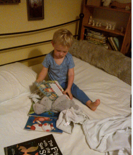 And bed – now that was exciting.  I’d blacked out the room with blankets (I took my curtains down about two years ago and still haven’t got round to replacing then), rolled up another blanket so he couldn’t fall down the side of the bed and Sister 1 had sent books, toys and nightlight with him.  I honestly thought there was a good chance we’d read a few books and he’d nod off.