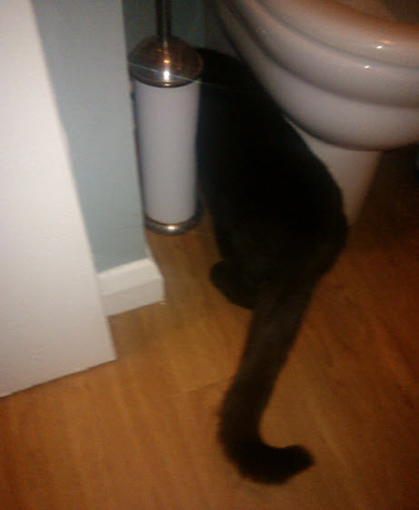 And finally, I think I have an evening of running round with a pyrex mixing bowl and wooden spoon ahead. Norman has spent the day in my bathroom like this:
