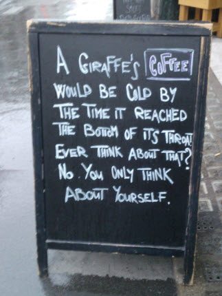 The sign at the coffee place I walk past on the way to work. I really should actually buy some coffee from there – it’s getting a bit awkward hiding to one side of the window to take these so the staff don’t see. It made me giggle.