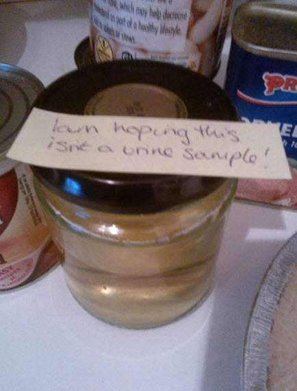 Over the weekend I’d made some blackberry vinegar for me and Sister 1. One of the ingredients is white wine vinegar and there was a bit left over….but I needed the bottle to put the finished product in. I stuck the extra in a jam jar and had left it on the workbench, but when I did my Sunday night de-clutter, I’d thought to myself ‘She’s going to think I have had a wee in a jam jar. I’ll pop it in the cupboard’. It seems nothing is safe though :o)