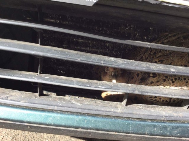 On Thursday morning Dad thought he could hear a tapping sound from the front of his car. A close inspection relevealed….a pheasant stuck behind the grill.