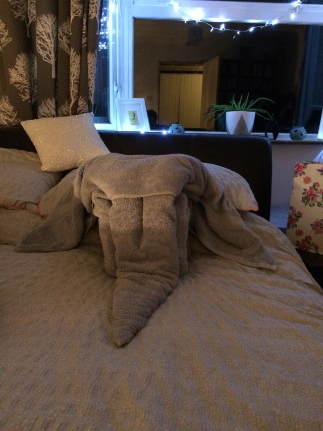 This caused me problems as I obviously couldn’t unfold the elephant, but happily I’d taken our own towels, so elephant got to sit on the window seat and survey the garden, indefinitely. We also got chocolates on our pillows. It was like a posh hotel. I’d quite like to do a write up on Trip Advisor, but I’m not sure it would go down well if people started turning up. For the record though, not only do you get snuffles from a lovely old boxer, animal shaped towels and bedtime chocolates, you also get fruit and yogurt snacks and lunch of avocado, salmon and poached eggs – freshly laid by the chickens in the garden, no less. It’s really rather special. So should you find yourself on the back of beyond Bumpkinsville (because yes, it’s REALLY out of the way), and spot an elephant made of towels staring out of a window and chickens roaming in the garden, you might want to pop in… ;o)