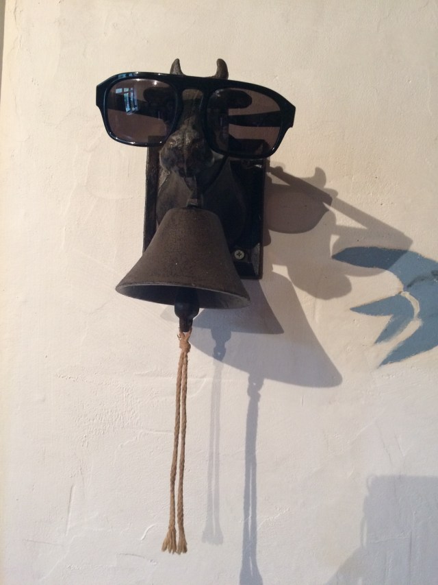 As cool as a cow in sunglasses. (The bell is on our kitchen wall for some reason. Himself uses it to store his sunglasses…)