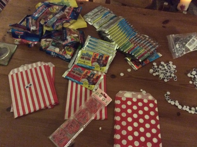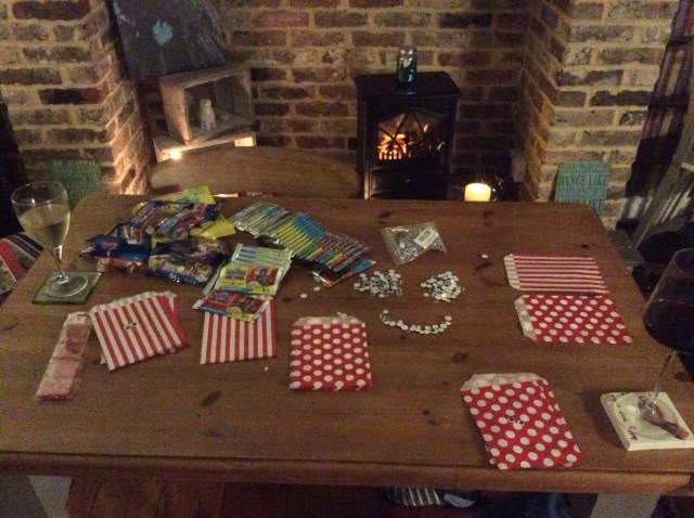 (If you want to do something similar, the bags and eyes are from Amazon – you can get the tiny pegs there too – then you just need some string and your choice of fillers. There are cheaper options for Advent calendars, but this worked out significantly less than two Match Attax calendars – which apparently don’t contain proper packs of cards if the reviews are correct. And it’s ALOT less than the whisky advent calendar I saw advertised at…£145!)