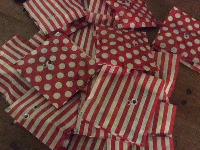 We pegged the pairs of bags together (one boy will have spots, one stripes. Each day they’ll both get a bag), and we’ll peg them all to a long piece of string that will be tied up in their house.