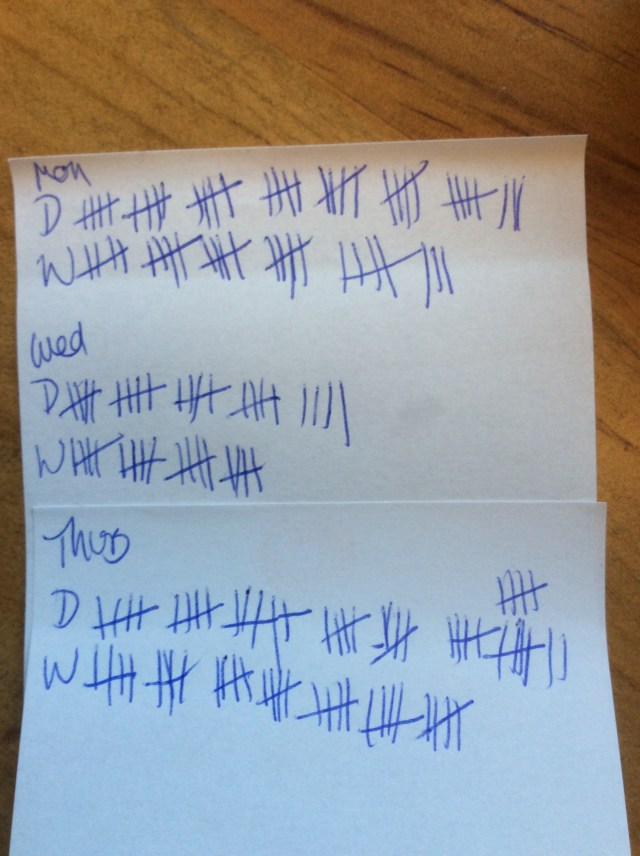 You see, Our Towers is close to a nature reserve where a lot of people walk their dogs, and I seem to have become obsessed with the numbers that walk past the house each day. Not just in a smiling at the cute brown puppy that bounces rather than walks, or marveling at the old couple who have seven dogs between them kind of way. I mean I do this: