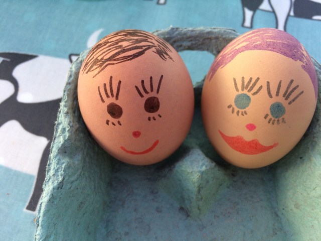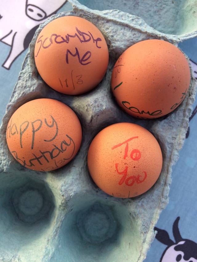And in a separate set of smiles, I forgot to show you the eggs Sister 2 gave me. They are delicious – laid by her free range chickens – and really don’t need any extra fancy stuff. Except she thought differently: