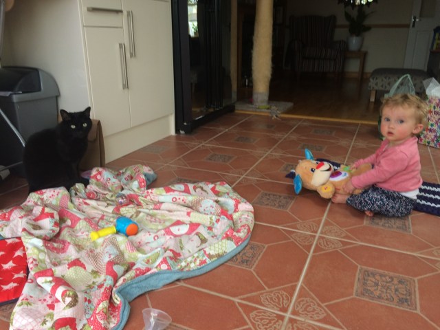 And we were doing so well, but then it was lunch time, and we weren’t doing so well anymore. Apparently Little Wisp gets hangry and was not impressed she had to wait for her food to cool for so long after I turned it into molten lava. And we had no highchair and she didn’t like my chair – even padded with cushions. So I put her on my lap and…she decided to help feed herself with her hands (a tomato-y affair), then reach up to me for a cuddle. I imagine it will come out of my cream jumper. One day.