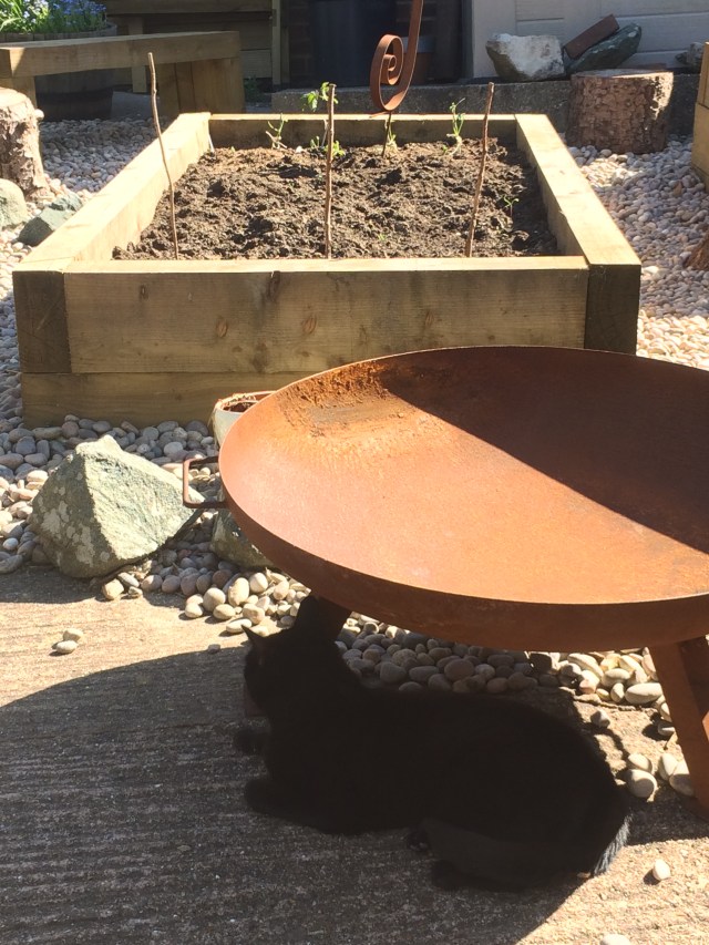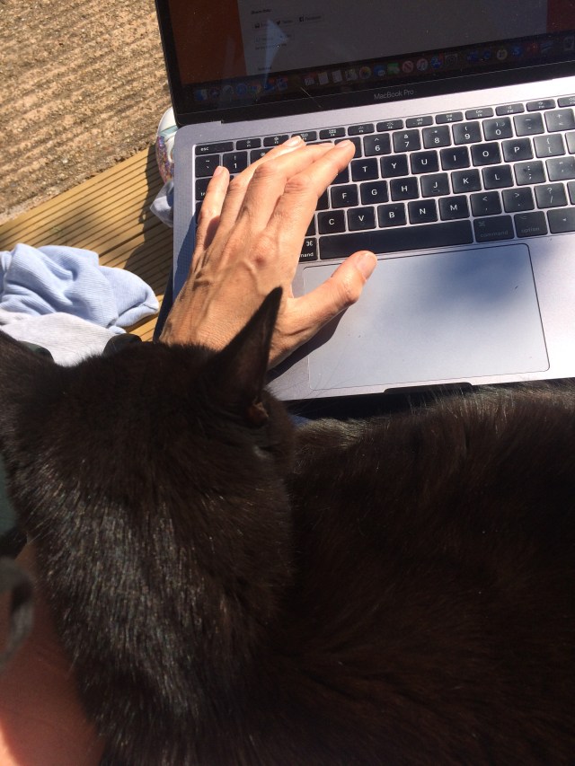 Meanwhile, I know when I shouldn’t even try, so I stuck to working online with some of my lovely clients today in the Hypno Hut, with Norman on guard under the fire pit, then helping with a bit of work on the computer..: