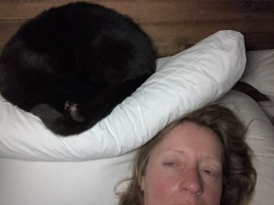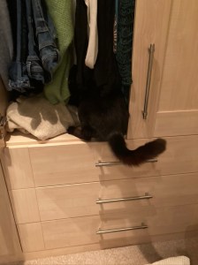 He’s moved for the moment and having gone through a phase on Mr R’s legs, he now snores loudly on the landing but always makes sure he is next to my head and staring disapprovingly in my face when the alarm goes off.
