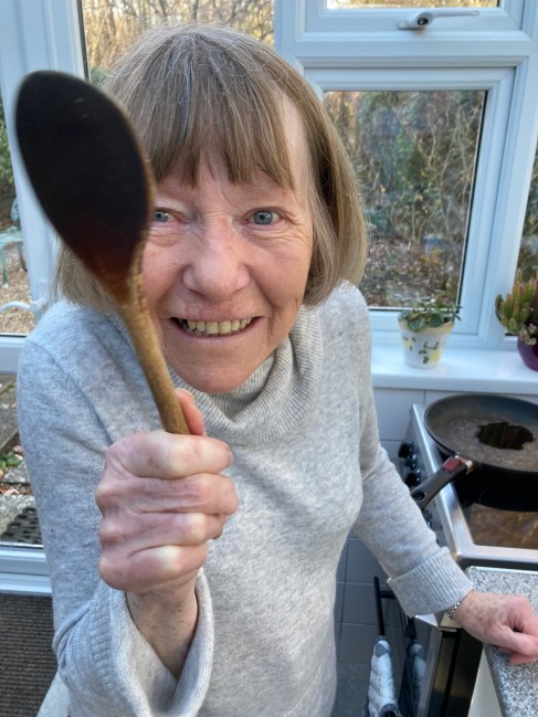 I stroked Mum with the wooden spoon and she had to rush off to the toilet because “you are making me laugh too much and I am going to wet myself, Pog!”