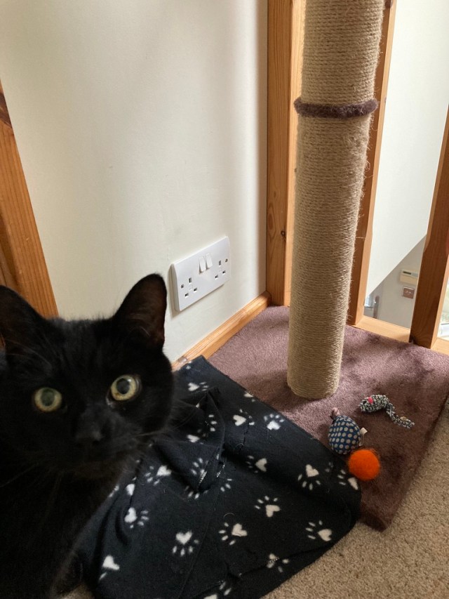 Norman has his space on the landing – his bed(s), scratching post and his toys:
