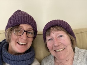 Since her stroke, following instructions is tricky and numbers mostly elude her. She has tried a couple of jumpers and there were many, many tears before they were handed over to others to finish. Finally we persuaded her that we all NEDDED scarves. So we all got scarves. And then she found a pattern for a hat and thought she’d do that….argh….no! So I made her a paper template and told her to make a square of knitting as bit as the square and we’d make hats that way.