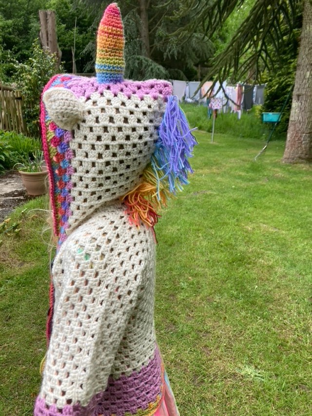 But I do love my makingness. And this is the best reaction I’ve had to anything to date , I think. This is a unicorn cardigan that I imagined in my head and made (without a pattern) for my nice – Little Wisp for her birthday – she opened it, put it straight on and said she never wanted to take it off: