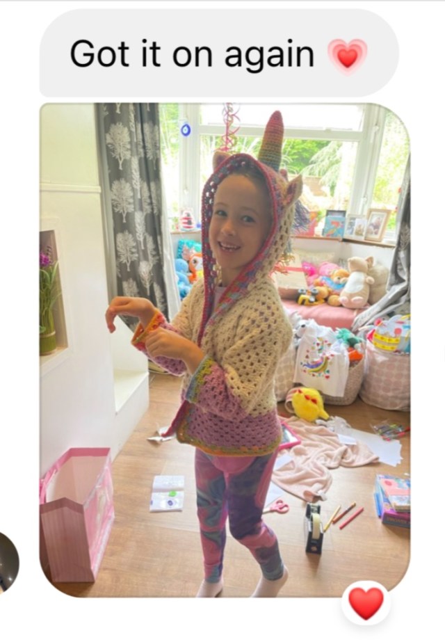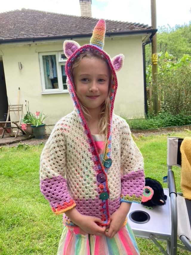 But I do love my makingness. And this is the best reaction I’ve had to anything to date , I think. This is a unicorn cardigan that I imagined in my head and made (without a pattern) for my nice – Little Wisp for her birthday – she opened it, put it straight on and said she never wanted to take it off: