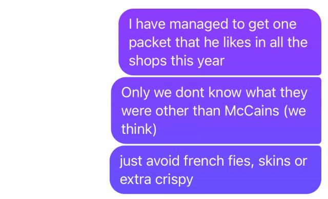 Even that wasn’t simple – Dad is very particular about his chips – in 9 months of shopping I’ve only managed to get one ‘really good bag’, only to forget what that was and get it wrong every time since.