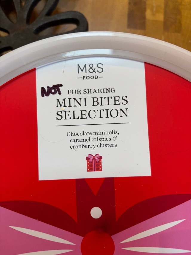 Yesterday I went to Marks and Spencer for a packet of Christmas biscuits (chocolate coated christmassy loveliness in a fancy pants tin). I ate many, many tins last year. I guess not enough though as this year they are nowhere to me seen. So instead I settled on a ‘Mini Bites Selection’. And then I panicked as it would be very easy for someone to assume they are for sharing. And they might eat all the good ones.
