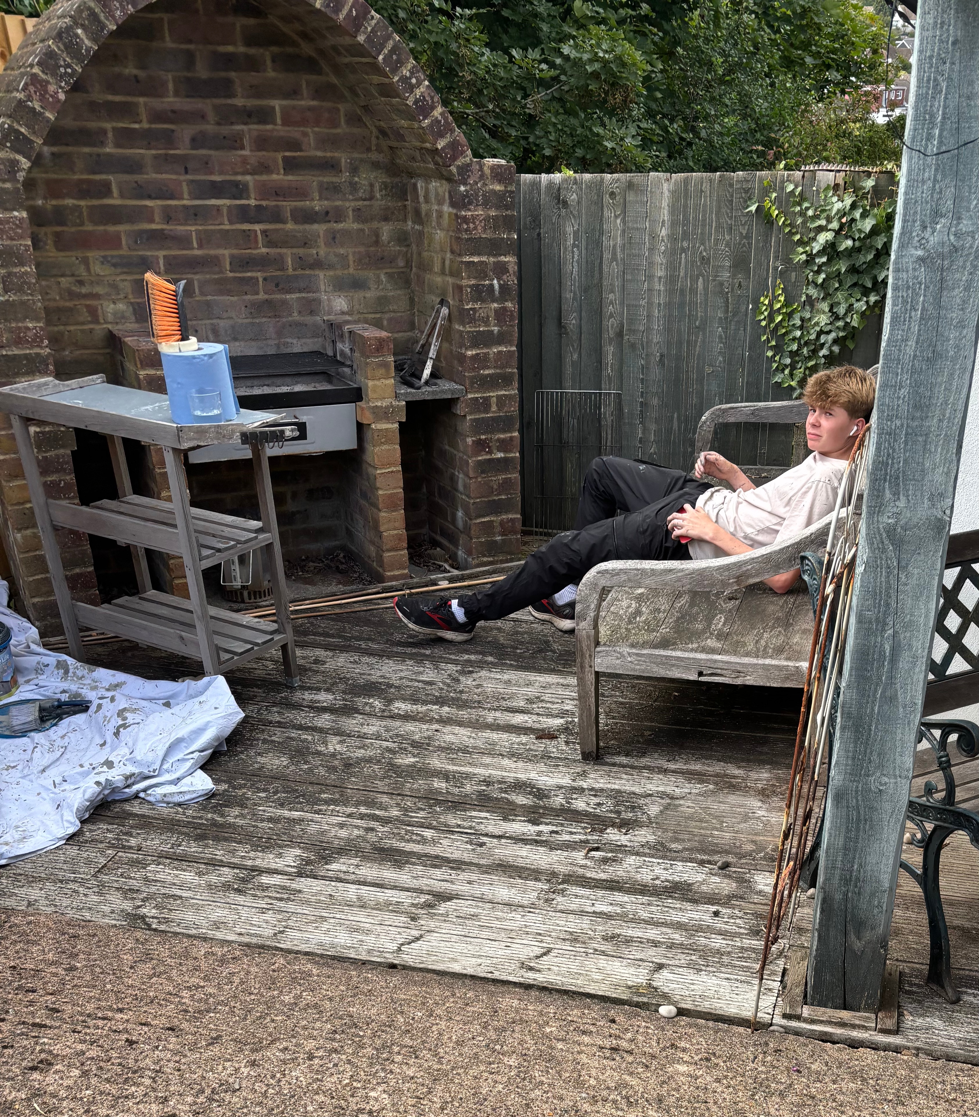 I went down the garden, where he’d moved the paint and brushes half an hour ago to start on the next area, to find him having a rest. Which would be totally reasonable, had he not just finished a 30 minutes break to eat lunch followed by a 45 minute ‘proper break’….