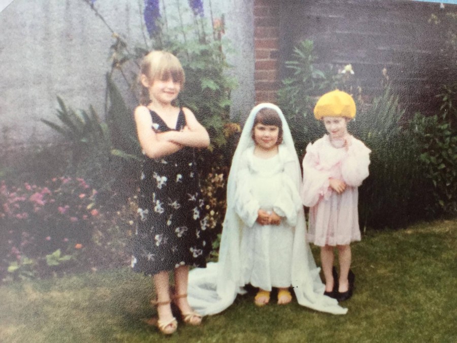 June 1981 Dressing up, Cassian’s sister is the bride – we’re the bridesmaids, obviously.