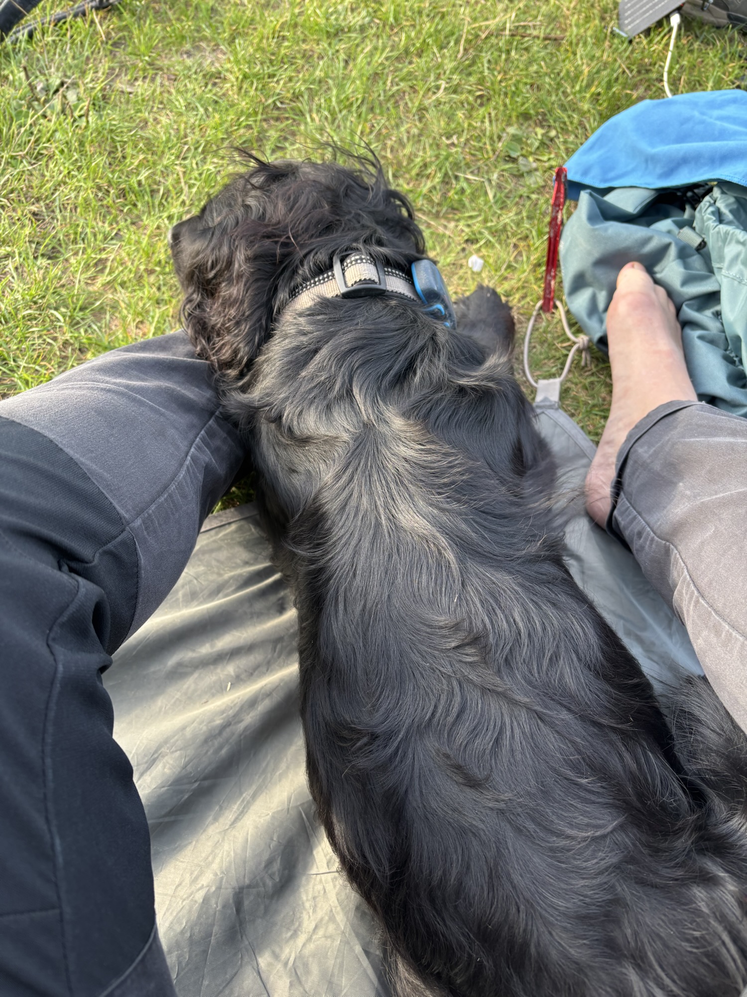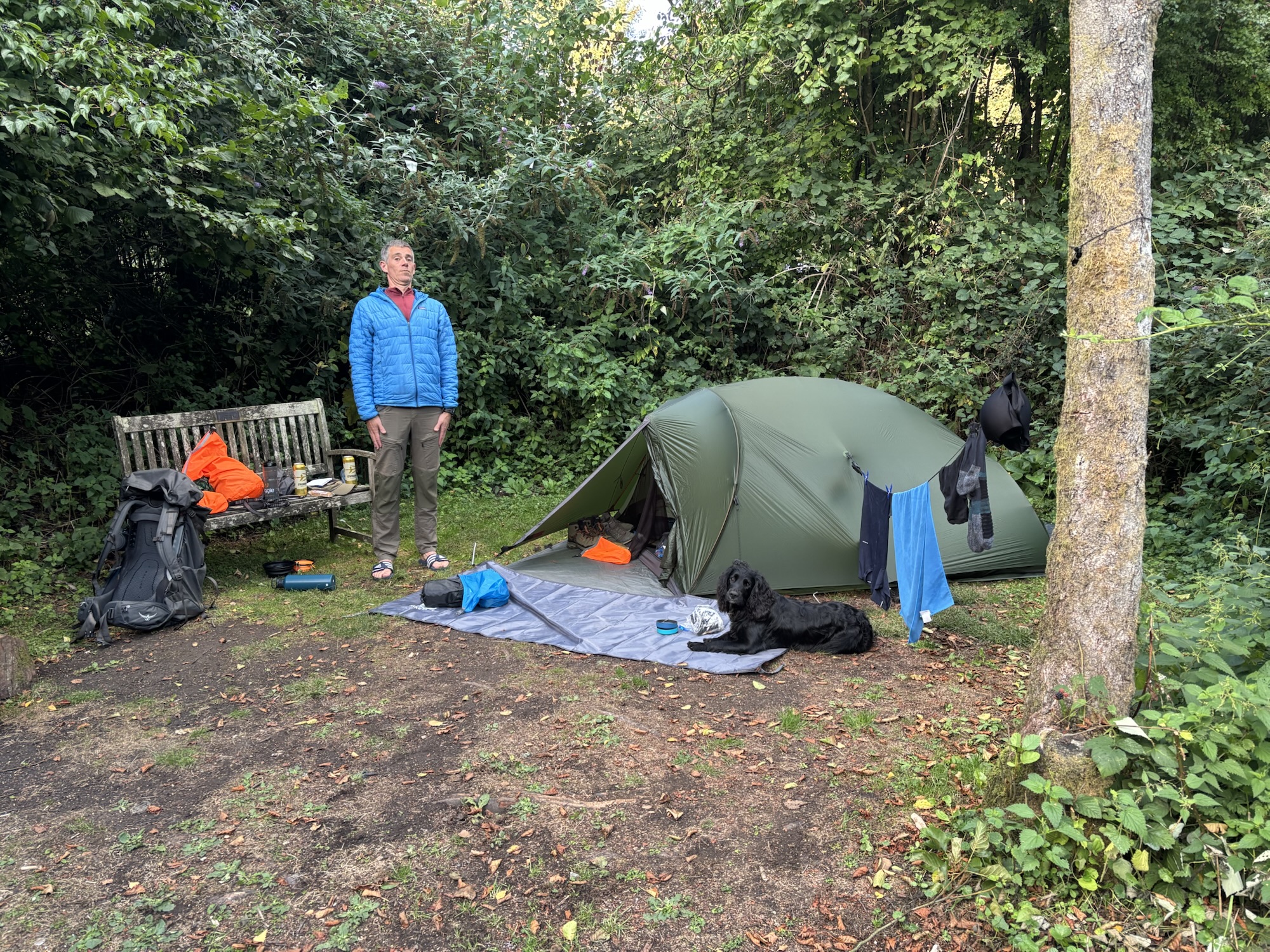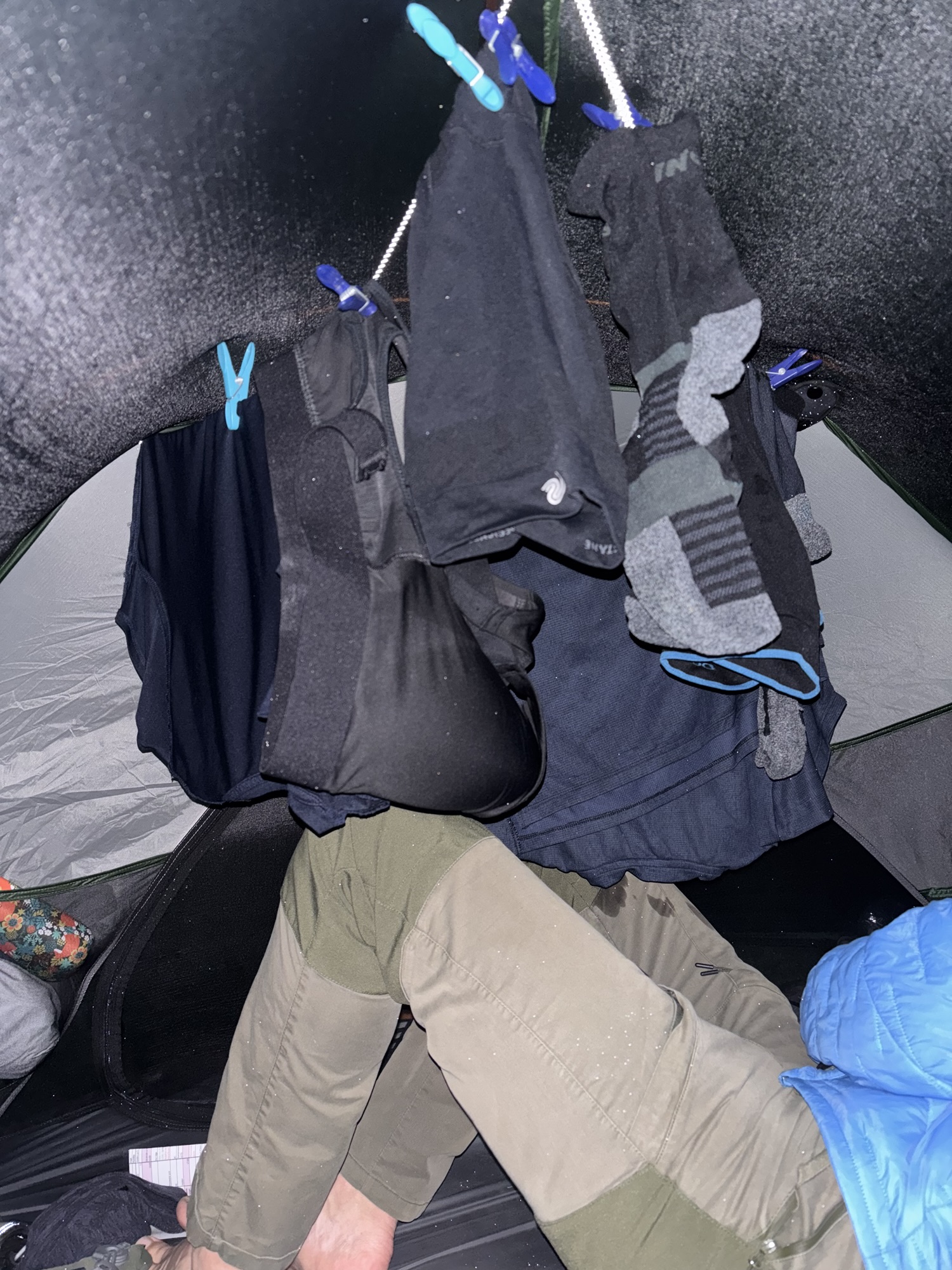 So we rigged the washing line up inside the two man and a dog tent and…both woke up with wet t-shirts on our faces. It was a little like being suffocated by dead fish.